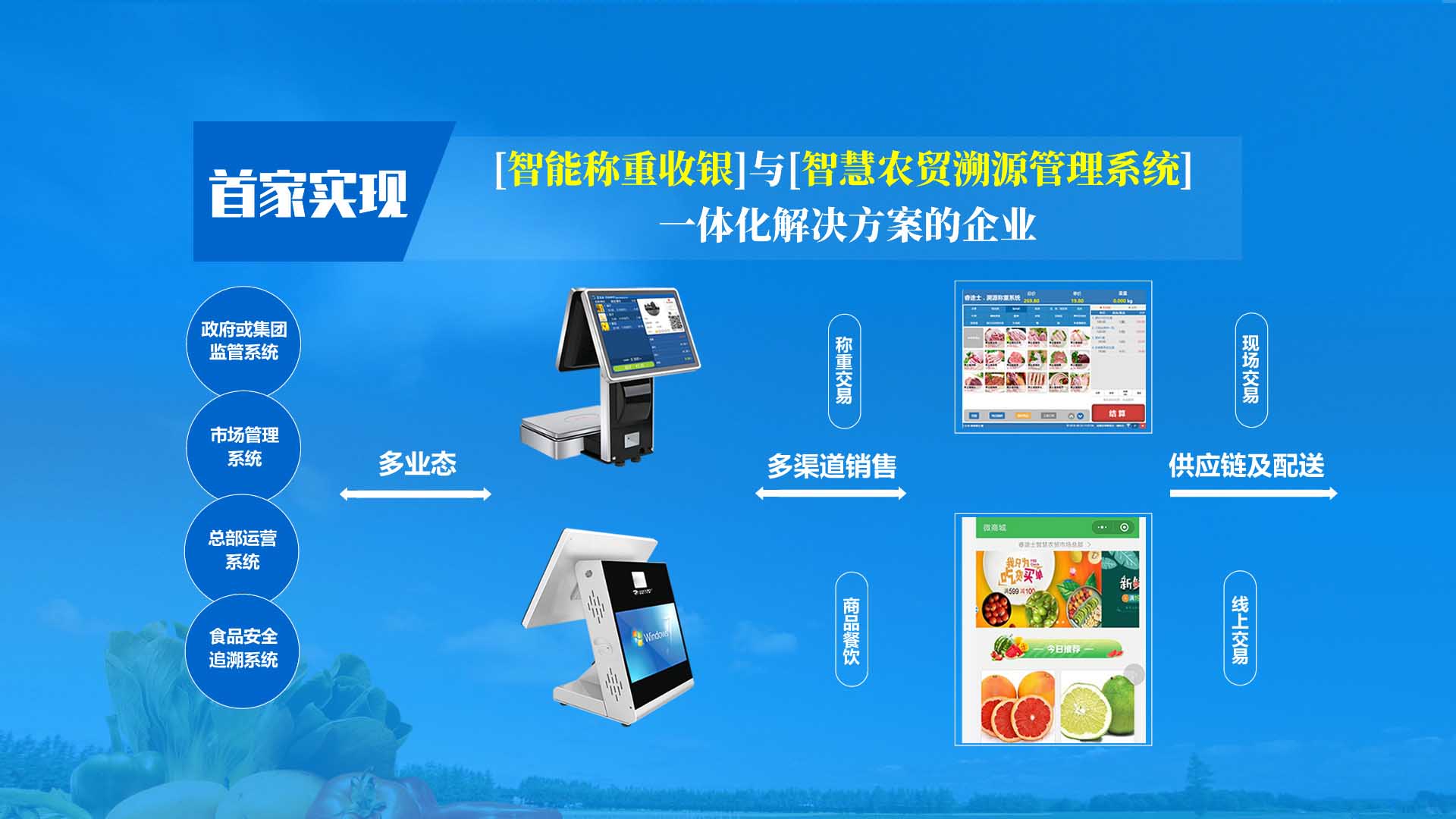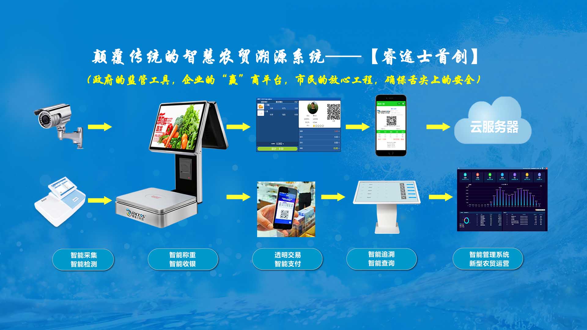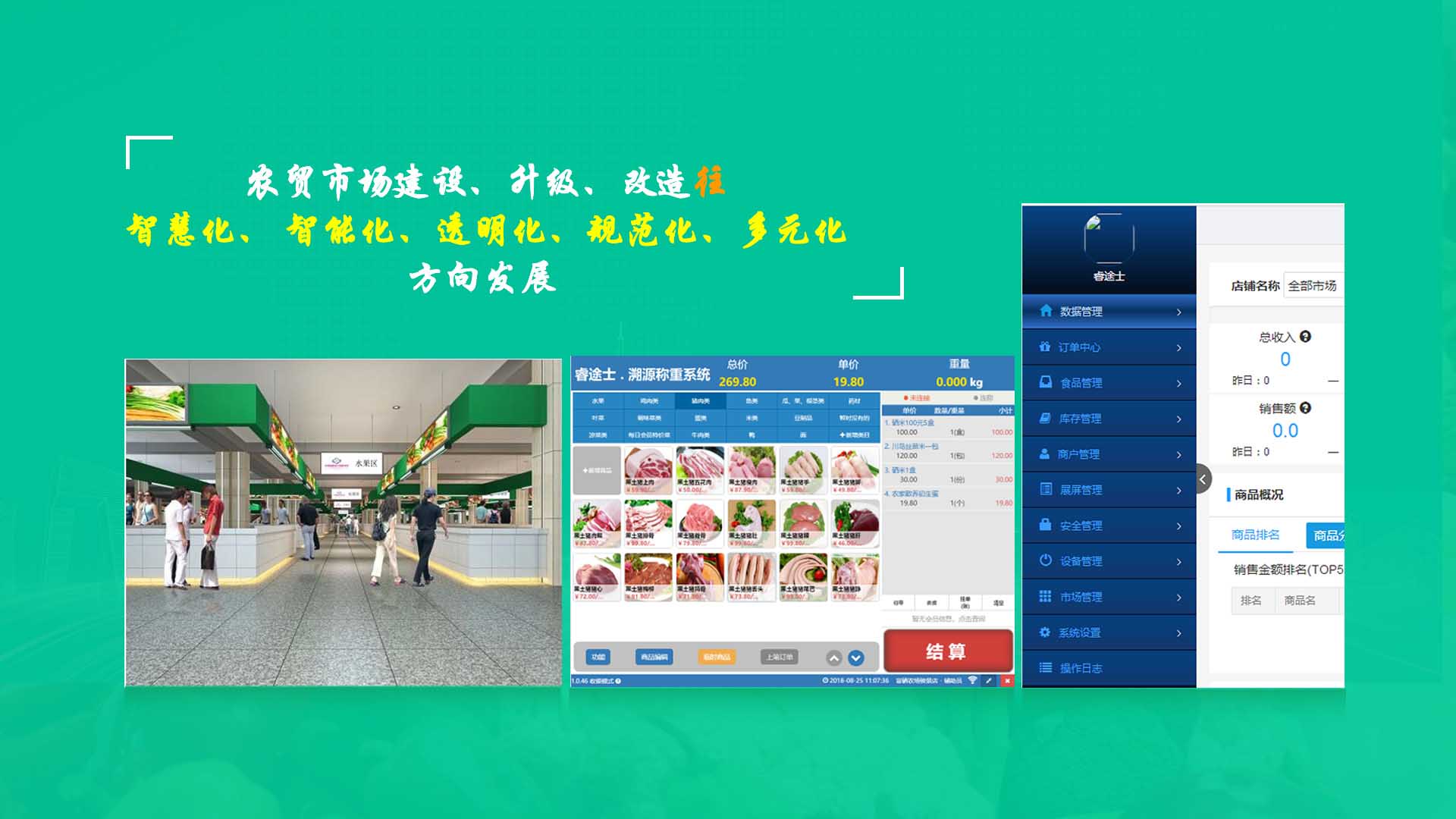 創(chuàng)新實現(xiàn)了【智慧農(nóng)貿(mào)溯源管理系統(tǒng)】與【智能稱重收銀】一體化解決方案,集市場管理、運營管理、溯源追溯、智能收銀大數(shù)據(jù)運用于一體,硬件、軟件與管理系統(tǒng)完美結(jié)合。適用于農(nóng)批、農(nóng)貿(mào)市場蔬菜、生鮮、水果、水產(chǎn)、肉類、熟食等稱重和非稱重銷售;由于采用一體化設(shè)計,解決了傳統(tǒng)農(nóng)貿(mào)市場無法實現(xiàn)的信息化、智能化、可追溯的管理問題;使稱重、收銀、追溯、管理、更透明、公正、安全,讓顧客無后顧之憂,給管理工作帶來極大的便捷與高效,對國內(nèi)農(nóng)產(chǎn)品行業(yè)的發(fā)展、農(nóng)產(chǎn)品流通管理起到了典范作用。 【睿途士首創(chuàng)】顛覆傳統(tǒng)的“智慧農(nóng)貿(mào)市場系統(tǒng)”,解決了傳統(tǒng)農(nóng)貿(mào)系統(tǒng)單一安卓掛屏,昂視不方便看、不直觀、無互動性,傳輸信息不齊全、不穩(wěn)定的問題,也解決了按鍵電子秤商品難找、商品代碼難記、按鍵操作不靈活、支付不智能,對收銀管理、銷售商品、菜名、菜價、打折、優(yōu)惠、會員、線上下單、采購等無法實現(xiàn)實際菜品交易和追溯等問題。 更具顛覆性的是睿途士智慧系統(tǒng)擁有三大管理平臺(市場管理平臺、總部運營管理平臺、商戶后臺管理平臺)、一個可視操作前臺和三大追溯功能,讓遠(yuǎn)程管理、數(shù)據(jù)傳輸、人機(jī)互動、智能控制、移動支付、大數(shù)據(jù)、互聯(lián)通信、云端存儲、人工智能、智能城市、電子定位、智能收銀等功能得以實現(xiàn)。
